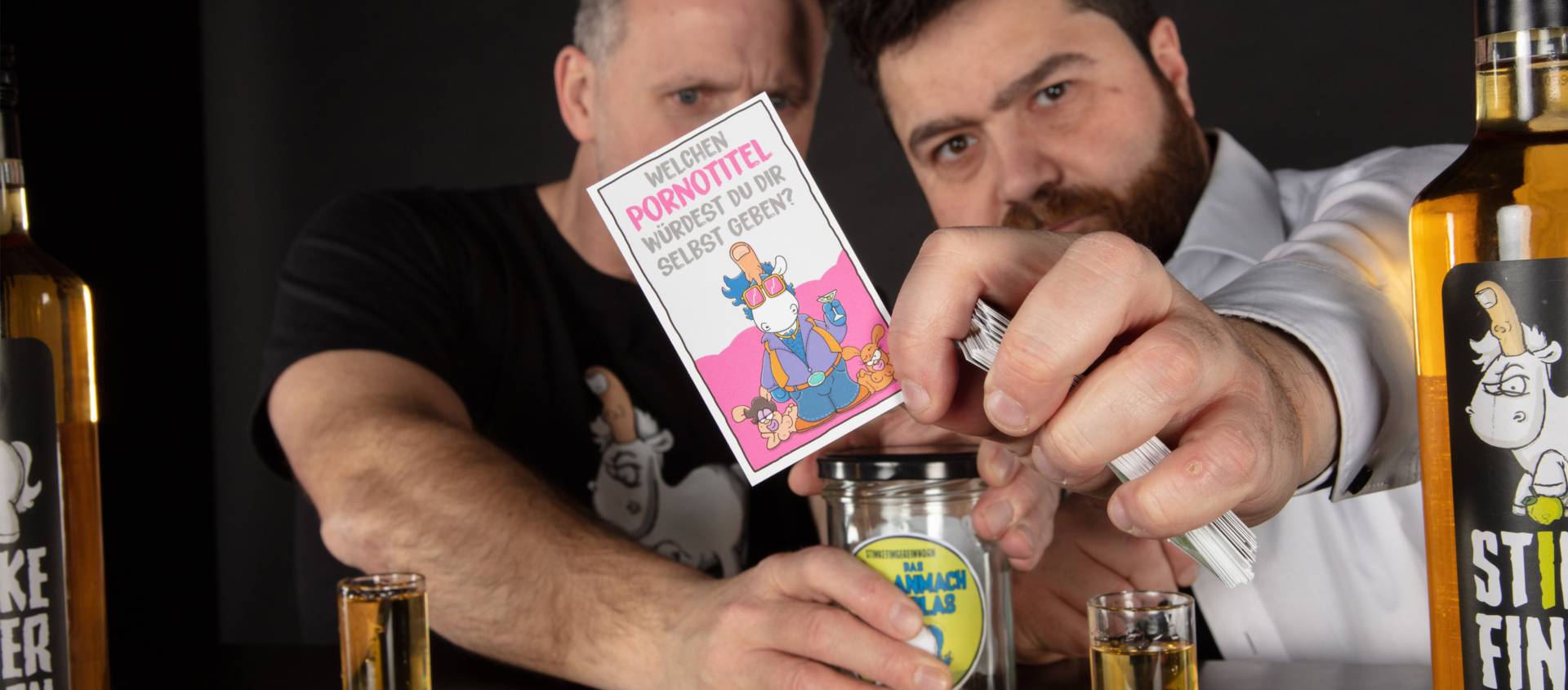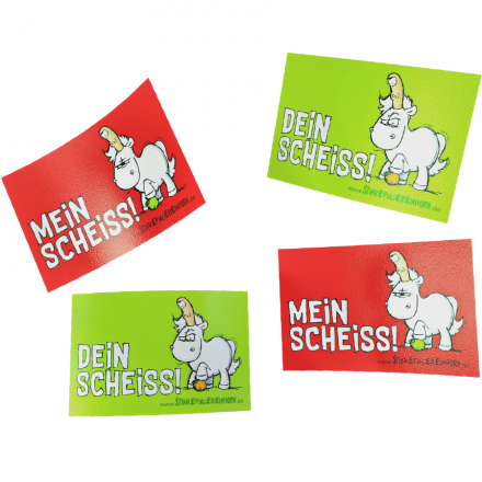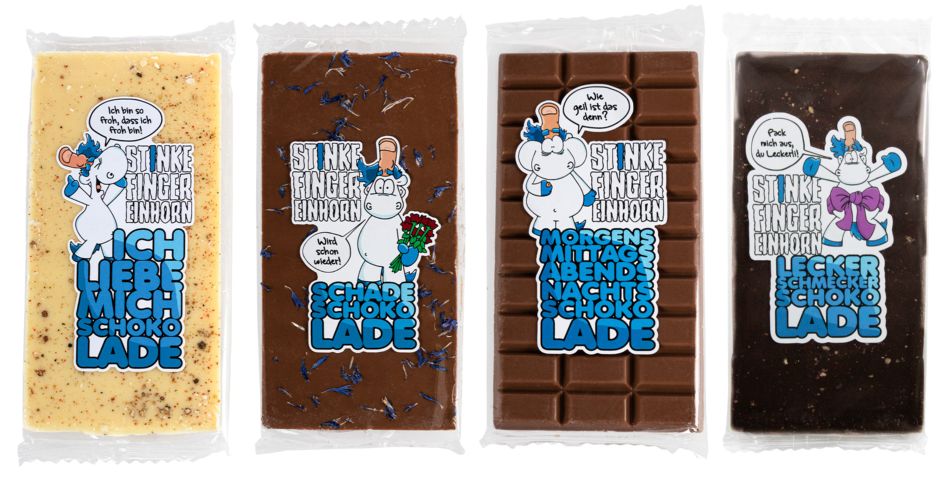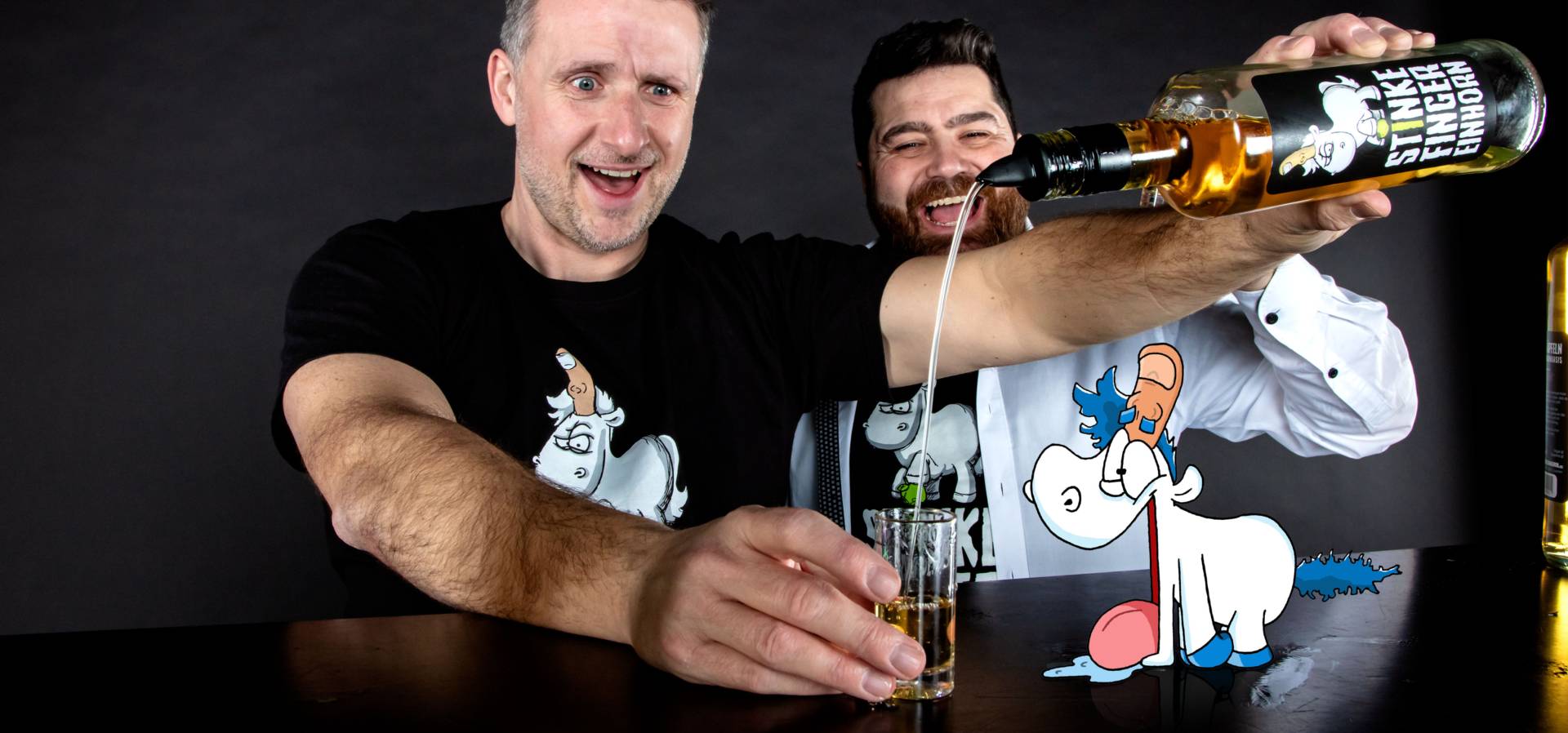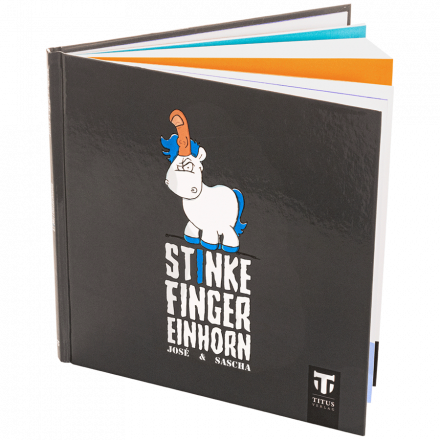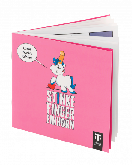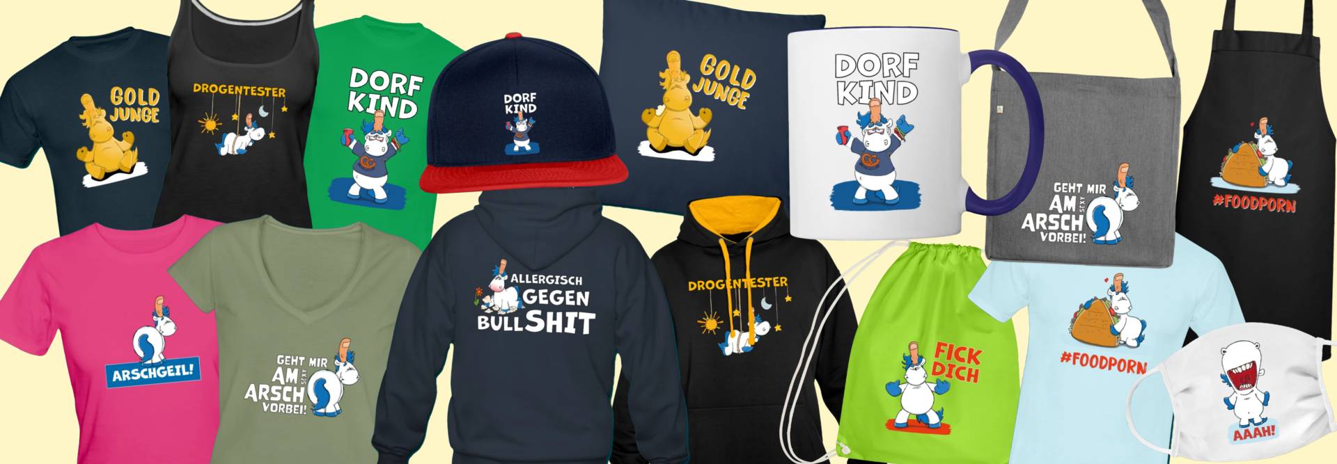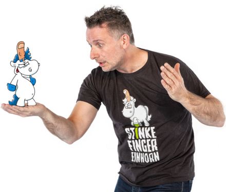 Es gibt T-Shirts mit meinem wunderschönen Gesicht drauf, ein Cartoon-Buch mit meinen Abenteuern, mein Lieblingsgetränk "Stinkefingereinhorn-Korn", witzige Aufkleber und ein fantastisches Anmach-Glas!